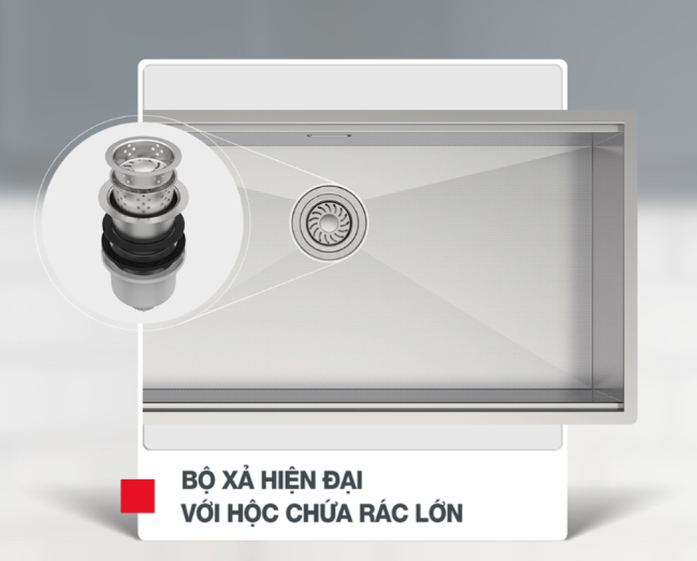 - Bộ xả cải tiến : bộ xả với hộc chứa rác lớn phù hợp với công năng sử dụng người Châu Á, ống Siphon mềm linh hoạt, dễ lắp đặt, dễ phát hiện chất bẩn bị tắc, tăng tiện ích sử dụng cho hộc tủ bên dưới chậu
