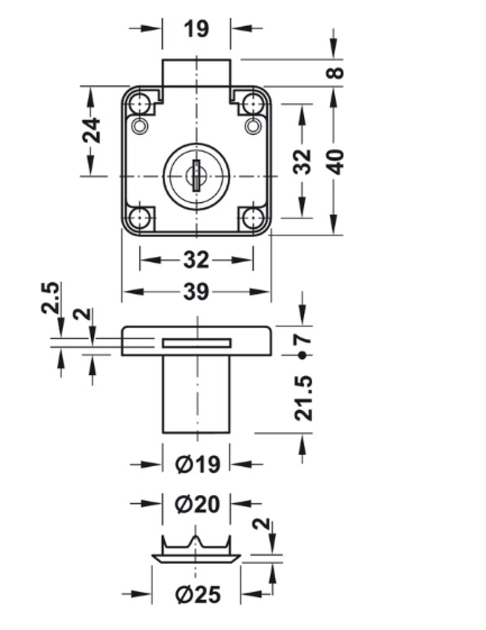 - Khóa vuông then gài cố định, với lõi chìa lõi trơn, khoảng cách từ cạnh cửa đến tâm lỗ ruột khóa 24mm