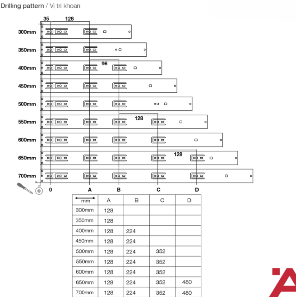 - Lắp đặt vào mặt bên : bắt vít vào dàn lỗ khoan 32mm