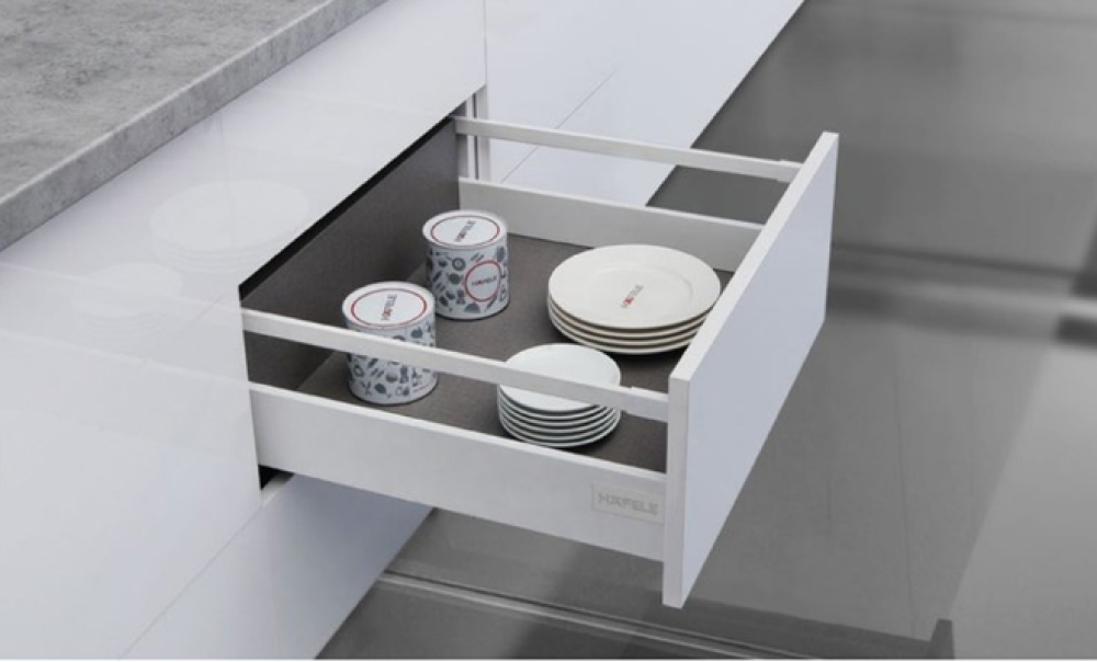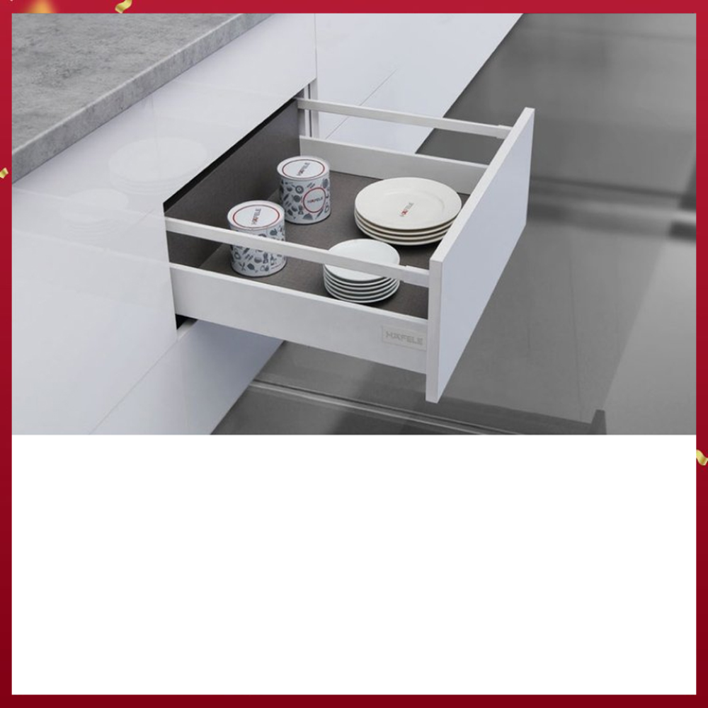 - Trọn bộ gồm : 1 cặp ray trượt mở toàn phần, 1 cặp thành hộp cao 84mm, 2 bas mặt sau, 2 bas mặt trước, 1 cặp thanh nâng cấp và 2 nắp che với logo Hafele